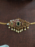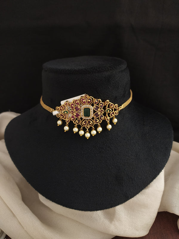 A timeless beauty, this antique traditional choker set is crafted with sparkling zircon stones and comes with a matching pair of elegant jhumkis. The intricate design and antique gold finish...