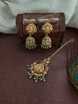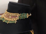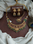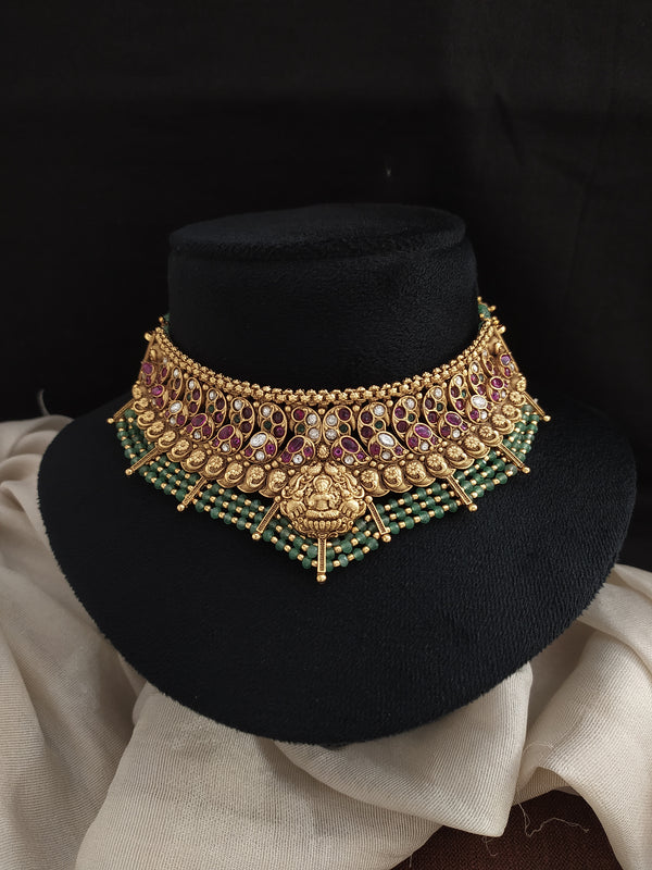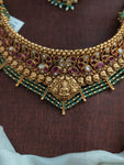 A masterpiece of heritage design, this Antique Lakshmi Choker Set features intricate Nakshi work with a central Lakshmi motif, flanked by a row of traditional mango designs and crowned with...
