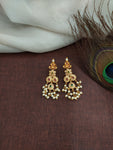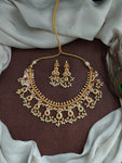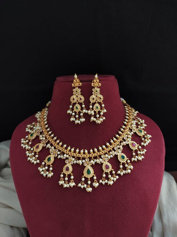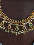 A timeless traditional piece, this Guttapusalu Necklace Set is crafted in a rich gold finish, featuring intricate detailing and clusters of pearl hangings that define the classic Guttapusalu style. Paired with beautifully matching earrings, this set brings regal charm and elegance to festive and bridal occasions.