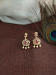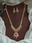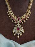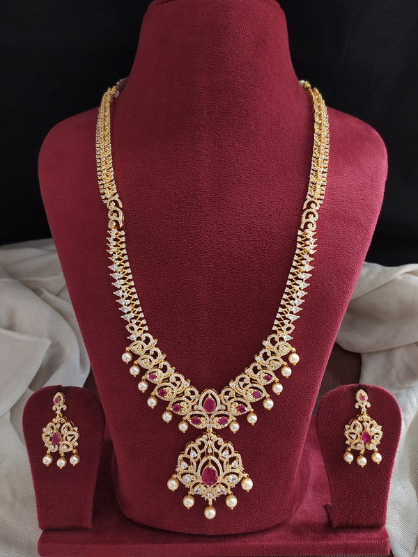 Designed for those who love grandeur with sophistication, this gold-plated zircon long set is adorned with ruby and white zircon stones, radiating a diamond-like sparkle. The set is completed with matching earrings featuring delicate pearl drops, making it an ideal choice for festive occasions and grand celebrations.