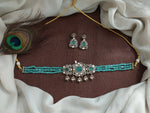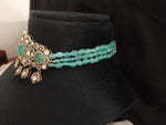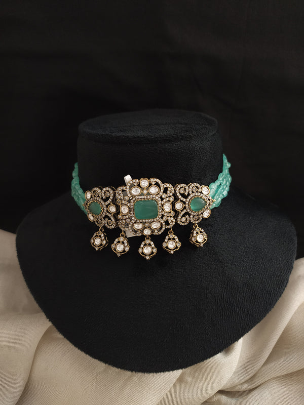 A stunning fusion of vintage charm and modern elegance, this Victorian choker set features a central Victorian-style pendant adorned with intricate detailing. The lush mint green beads add a fresh and...