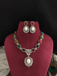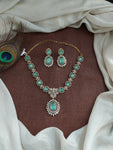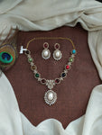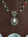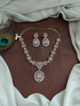 Add a regal touch to your festive or wedding look with this stunning Victorian gold finish zircon necklace set. Intricately crafted with high-quality zircon stones, this set is available in three charming color options: Navaratan, Baby Pink, and Mint. The design showcases Victorian elegance with a touch of traditional charm, making it perfect for ethnic wear. Comes with matching earrings to complete the set.