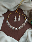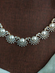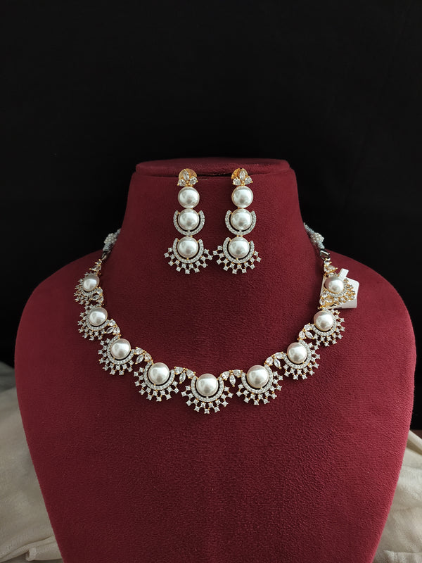 A stunning zircon necklace set adorned with sparkling CZ stones and semi-precious pearls, designed in an American Diamond style for an elegant diamond-like look. Perfect for engagements, receptions, parties, and other special occasions. Comes with matching earrings to complete your look.