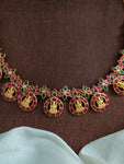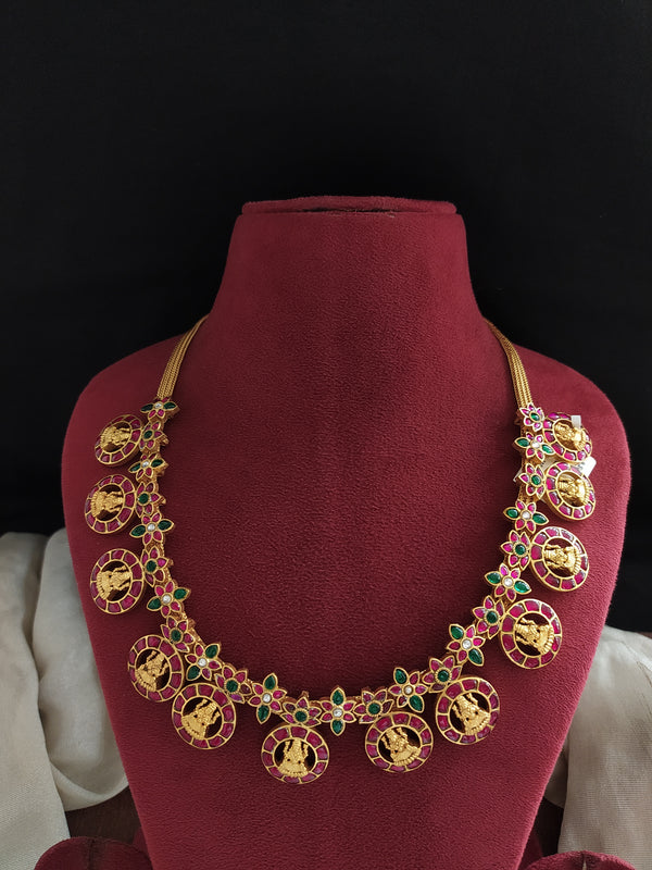 This mid-length Bottu Mala is a stunning blend of Jadau Kundan stones, Lakshmi motifs, and intricate floral designs, making it a heritage-inspired masterpiece. Crafted to resemble real gold jewelry, its regal...