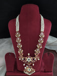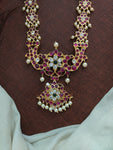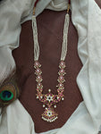 Celebrate tradition with this Real Araku Kemp Long Haram Set, designed with a striking "W"-shaped pendant and a vibrant kemp stone chain, further elevated by a moti mala. Adorned with pearl drops and crafted in kemp stones in shades of white, red, and green, this piece beautifully blends cultural heritage with timeless elegance.