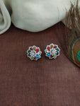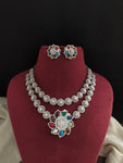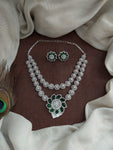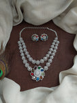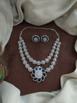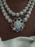 An elegant double-layer zircon necklace set crafted in a sleek rhodium (silver) finish, designed with a delicate floral pendant that adds a soft yet statement touch. The layered styling gives a refined diamond-look sparkle, while the matching floral stud earrings complete the set beautifully. Available in refreshing and festive shades — Baby Pink, Mint, Ruby, Green, Blue, and Navaratna — making it perfect for party wear, receptions, farewells, and elegant festive occasions.