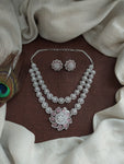 An elegant double-layer zircon necklace set crafted in a sleek rhodium (silver) finish, designed with a delicate floral pendant that adds a soft yet statement touch. The layered styling gives...