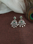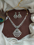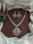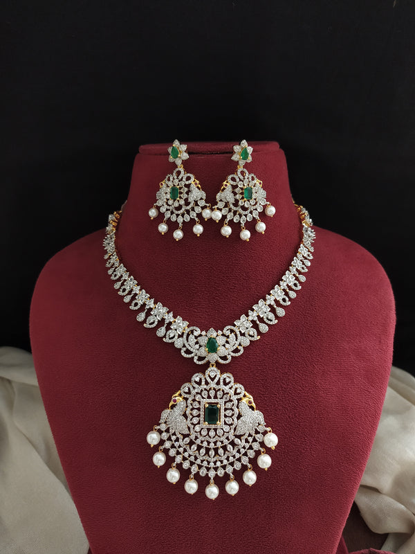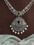 A timeless traditional necklace set crafted with sparkling zircon stones in a two-tone diamond finish (gold with silver) — giving it the luxurious look of real diamond jewelry. Features a beautifully designed pendant with elegant pearl drops and matching earrings. Available in classic Green and Ruby options, ideal for weddings, festive occasions, or as a graceful gift.