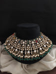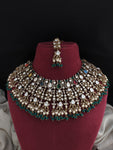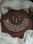 Exquisite Victorian-style bridal necklace set crafted with shimmering Moissanite stones and Swarovski pearl drops. Comes with matching earrings and tikka. Available in Navaratan, White, and Ruby – perfect for weddings,...