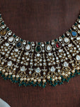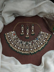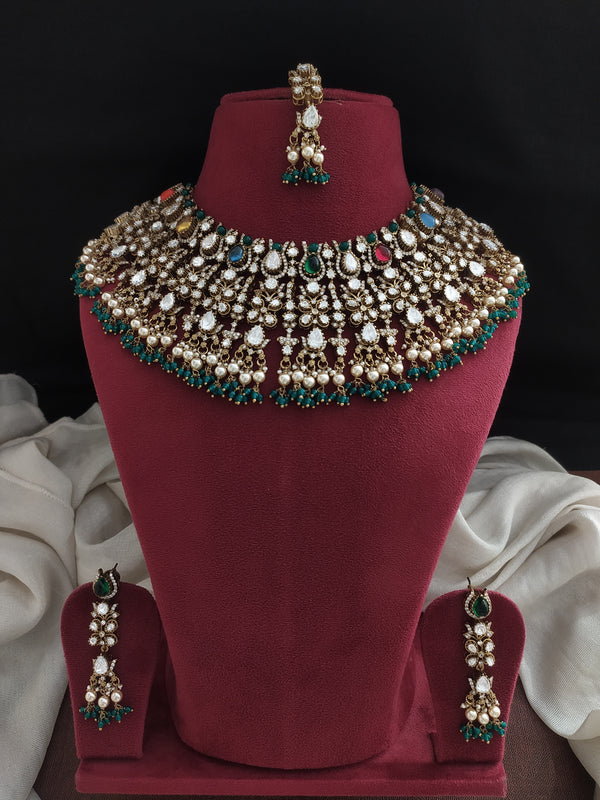 Exquisite Victorian-style bridal necklace set crafted with shimmering Moissanite stones and Swarovski pearl drops. Comes with matching earrings and tikka. Available in Navaratan, White, and Ruby – perfect for weddings, receptions, and grand occasions.