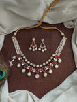 A blend of vintage charm and regal sparkle — this Victorian-style Polki Kundan choker necklace set is crafted with semi-precious Moissanite stones. Available in two elegant shades: Mint and Ruby (Red), and comes with matching earrings to complete your festive or bridal look.
