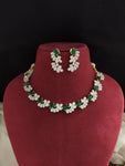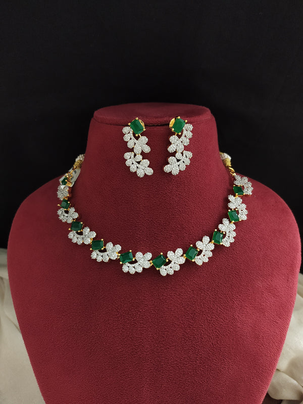 A stunning zircon necklace set crafted in a two-tone diamond finish (gold with silver) — just like real diamond jewelry. Available in elegant Green, rich Ruby, and deep Violet center stones, this lightweight set includes matching earrings and is perfect for parties, weddings, or festive wear.