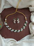 A stunning zircon necklace set crafted in a two-tone diamond finish (gold with silver) — just like real diamond jewelry. Available in elegant Green, rich Ruby, and deep Violet center...