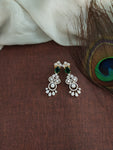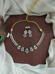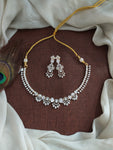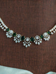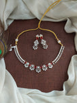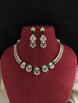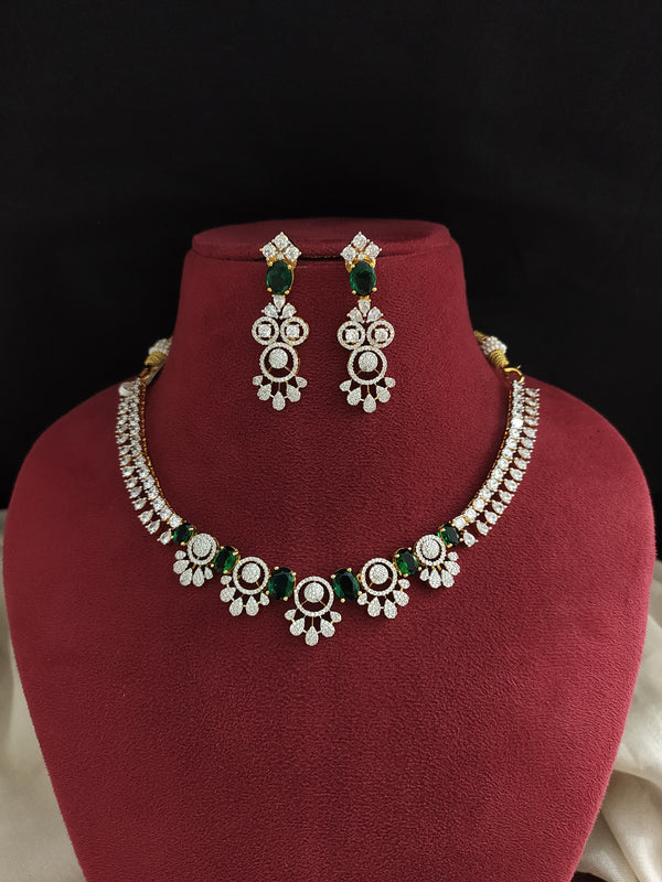 Gracefully designed zircon necklace set in a premium diamond finish (two-tone gold and silver), crafted to mimic the brilliance of real diamonds. Embellished with colored zircon stones in Green, Ruby, and White, this set includes a matching pair of earrings — perfect for weddings, festive wear, or elegant evening occasions.