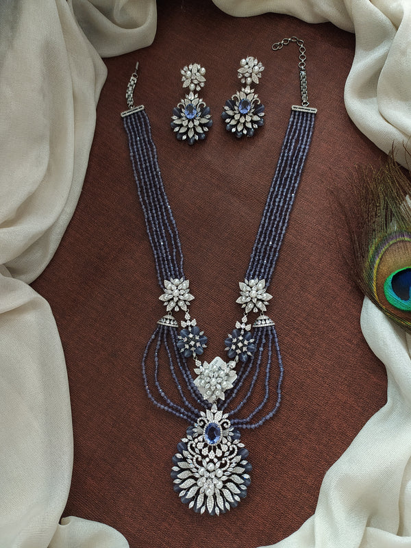 Discover the elegance of this beautifully crafted Zircon Stone Layered Mala Set, available in three exquisite colors—Violet, Mint, and Baby Pink. This set features a delicately layered mala that cascades gracefully, adding a touch of sophistication to any outfit. The floral-design pendant, encrusted with premium zircon stones, enhances the beauty of the piece with its intricate craftsmanship and dazzling sparkle.