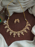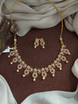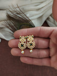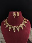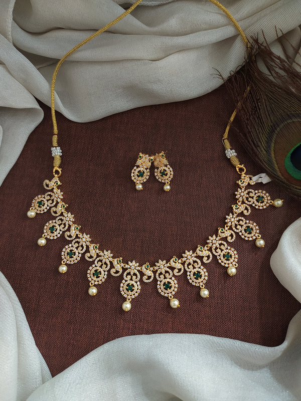Introducing our mesmerizing Peacock And Floral Design Zircon Necklace Set, a regal addition to our Gold Plated Diamond Sets collection. Crafted to perfection, this set features intricate peacock and floral motifs adorned with sparkling ZIRCON and AD stones. The rich hues of green, white, and ruby lend a vibrant and luxurious touch to each piece. Whether worn for weddings, parties, or special occasions, this necklace set exudes opulence and elegance. The attention to detail and exquisite craftsmanship make it a true statement of sophistication. Elevate your ensemble and command attention with the enchanting beauty of our Peacock And Floral Design Zircon Necklace Set.