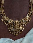 A majestic Antique Lakshmi long haram set beautifully styled in a V-shaped silhouette to create a wider, grander neckline presence. Featuring a classic Lakshmi motif with intricate antique detailing, this design enhances traditional looks with depth and elegance. Ideal for weddings, temple functions, and festive occasions, it pairs effortlessly with silk sarees and bridal ensembles for a rich, heritage finish.