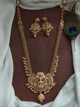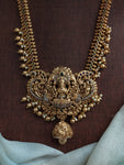A majestic Antique Lakshmi Long Haram Set crafted in classic temple jewellery style, featuring Goddess Lakshmi motifs that symbolise prosperity, grace, and timeless tradition. Designed in a rich antique gold...