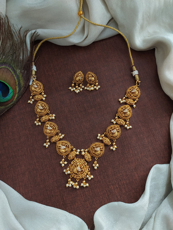 Indulge in the allure of antiquity with our Antique Peacock Design Nagas Work Zircon Necklace Set, a masterpiece that seamlessly marries traditional craftsmanship with contemporary elegance.