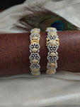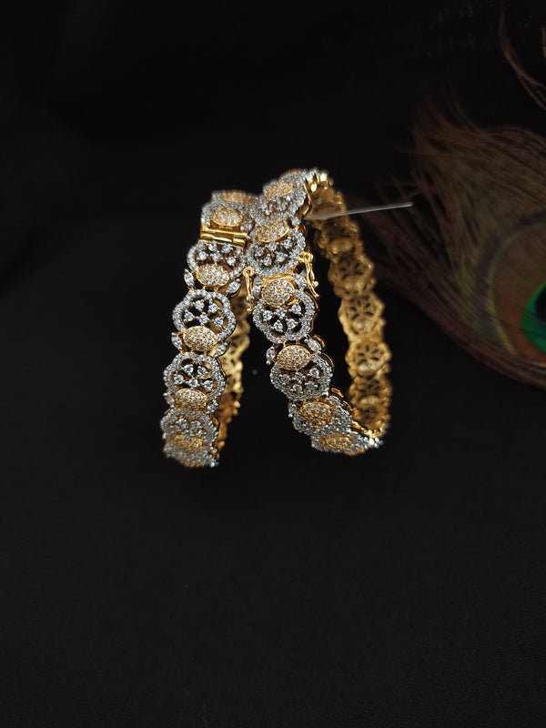 Elevate your accessory game with our Vibrant Design Dual Tone Openable Bangles. From our exquisite Rose-Gold and Gold Diamond Collection, these bangles boast a captivating blend of elegance and vibrancy. Adorned with sparkling zircon and AD stones, they exude opulence and luxury. Each bangle is meticulously crafted for a flawless finish and features an openable design for easy wear allowing you to mix and match according to your style preferences. Choose from the captivating color options of Gold & Silver or Rose Gold to complement your ensemble and make a bold fashion statement.