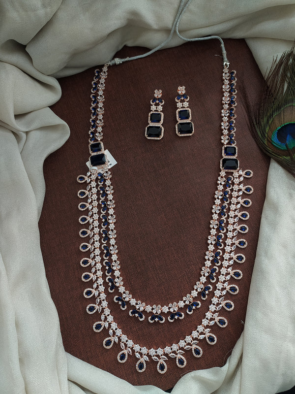 Adorn yourself with the elegance of our Graceful Bloom rose-gold long haram set. The double-layer design features intricate floral patterns crafted with sparkling zircon stones. This set is available in two enchanting colors, Hydro-Blue and Green, adding a touch of grace to your ensemble. Ideal for special occasions and events.