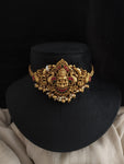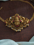Adorn yourself with divine elegance by wearing our Small Lakshmi Choker with Earrings. The intricate design features Lakshmi and peacock motifs embellished with Kundan stones in red and green hues. The set is complemented by peacock-studded Lakshmi earrings, creating a harmonious and graceful look. Perfect for traditional ceremonies and festive occasions.