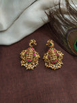 Adorn yourself with divine elegance by wearing our Small Lakshmi Choker with Earrings. The intricate design features Lakshmi and peacock motifs embellished with Kundan stones in red and green hues....