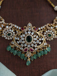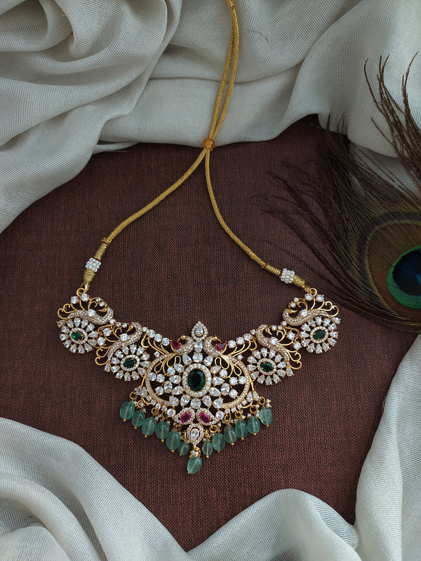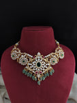 Introducing our exquisite Gold Plated Moissanite Stone Amazing Choker Set adorned with mint color beads. Part of our luxurious Gold-Plated Diamond collection, this set is meticulously crafted to perfection. Featuring shimmering moissanite, zircon, and AD stones, it exudes opulence and elegance. Elevate your ensemble with the timeless beauty of this choker set, perfect for adding a touch of glamour to any occasion. The mint color beads add a refreshing and unique twist to the classic design, making it a standout piece in your jewelry collection. Embrace sophistication and grace with this stunning choker set that effortlessly captures attention and admiration.