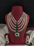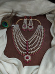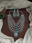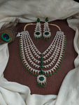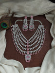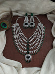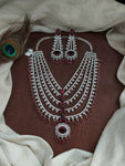 A statement layered necklace set crafted with dazzling CZ stones in both Rhodium and Diamond finishes. Designed for weddings, this grand set is perfect for brides who want elegance and...
