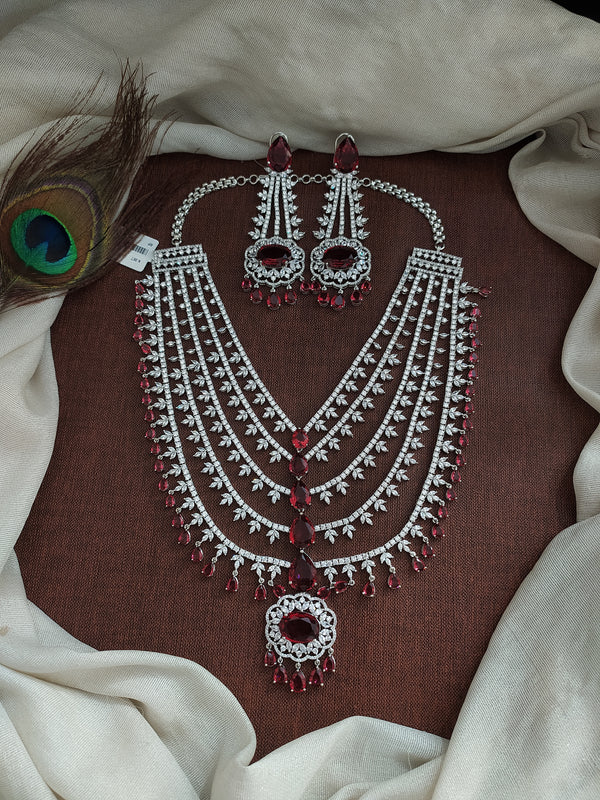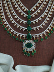 A statement layered necklace set crafted with dazzling CZ stones in both Rhodium and Diamond finishes. Designed for weddings, this grand set is perfect for brides who want elegance and grooms who want a celebrity-inspired look. Available in multiple colors to perfectly match your outfit or complement your partner’s attire.