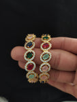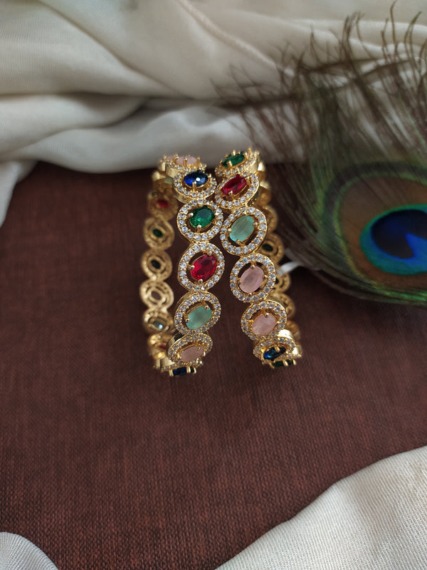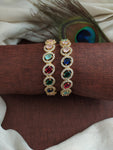 Adorned with Navratna stones, each bangle tells a story of vibrant hues and celestial beauty. Part of our esteemed Gold-Plated Diamond Collection, these bangles are perfect for elevating any ensemble, whether it's a formal affair or a casual outing.