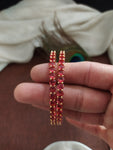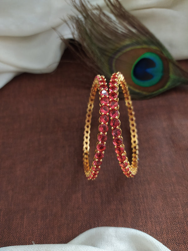 Elevate your style with our Stunning Simple Design Gold-Plated Thin Zircon Bangles, a dazzling addition to our gold-plated diamond collection. Crafted with precision and adorned with radiant ZIRCON stones and AD accents, these bangles exude timeless elegance. The sleek and minimalist design enhances their versatility, making them perfect for both casual and formal occasions. Available in captivating shades of Blue, Ruby, Violet, and Green, these bangles add a pop of color to any ensemble. Whether worn solo or stacked, they are sure to make a statement. Embrace sophistication and grace with our Stunning Thin Zircon Bangles, the epitome of understated luxury and refined beauty.