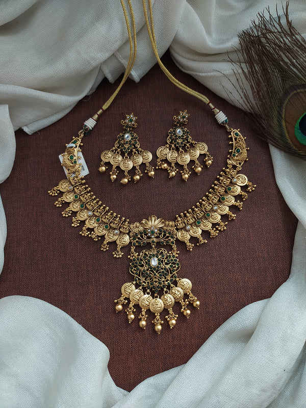 Description: Indulge in the timeless beauty of our Antique Emerald Necklace Set, a celebration of traditional craftsmanship. This exquisite set is meticulously crafted with emerald and white stones, creating a stunning piece that resonates with elegance. The addition of lord Lakshmi coins adds a touch of divine grace to this traditional ensemble.
