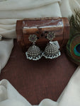 Introducing our enchanting Oxidised Jhumki Collection, a fusion of tradition and modernity. Crafted with intricate details, these jhumkis feature captivating blue, ruby, and white stones, accentuated with delicate pearl drops.