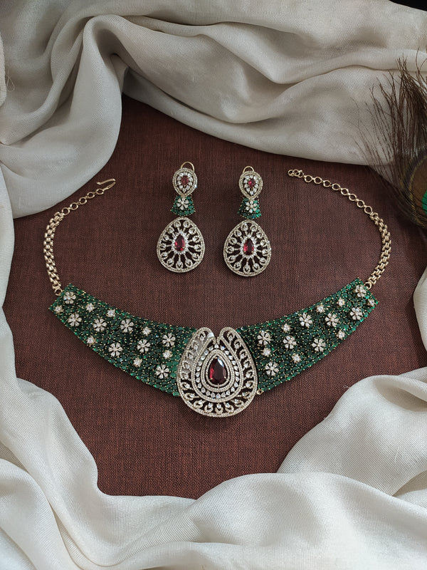 Step into royalty with this Victorian emerald green choker necklace set, crafted with sparkling stones that radiate a magical garden-like charm. The statement choker, paired with matching teardrop earrings, brings...