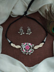 Complete with matching peacock studs, this Choker set is a perfect choice for those who seek to make a fashionable statement while embracing the elegance of pearls and the modern touch of oxidized enamel.