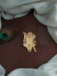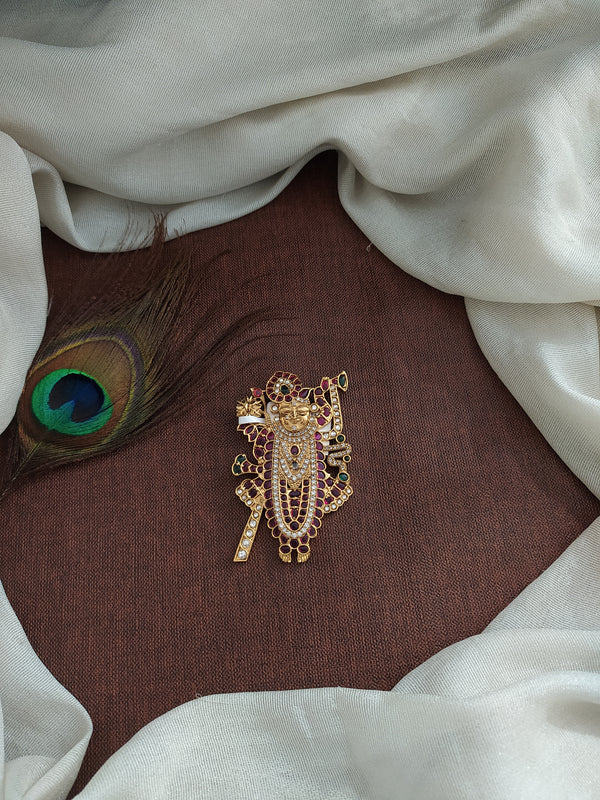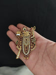 Elevate your traditional look with our Antique Kemp Goddess Pendant, a stunning blend of heritage and craftsmanship. Featuring a divine goddess motif, this intricately designed pendant is adorned with Kemp stones in a beautiful mix of White, Red, and Green, creating a rich and vibrant aesthetic. The antique gold finish enhances its timeless appeal, making it an ideal addition to any temple jewelry collection.