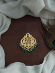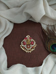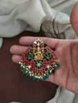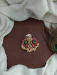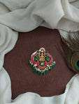This exquisite Jadau Kundan pendant features a majestic Lakshmi motif at the center, surrounded by intricately placed Kundan stones. Available in two regal combinations—red & green with green bead drops and...