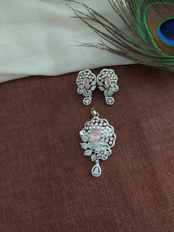 The pendant hangs from a delicate chain, adding grace and elegance to the design. The set also typically includes matching earrings, completing the ensemble with a cohesive and radiant look.