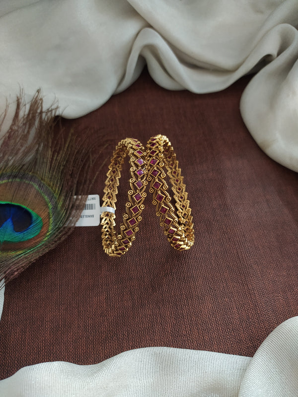 Embrace the timeless beauty of tradition with our Antique Rhombus-Shaped Ruby Bangles. These exquisitely crafted bangles are a perfect blend of traditional design and vibrant color, making them an essential addition to your jewelry collection. Whether worn alone or stacked, these bangles are sure to add a touch of elegance to any outfit.