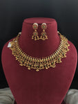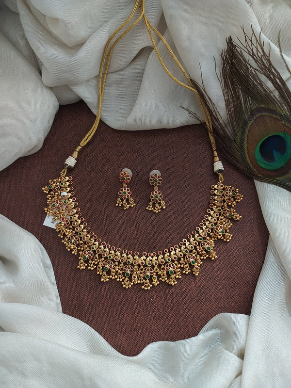 Adorn yourself with timeless elegance in our antique kemp necklace set. The exquisite design features vibrant kemp stones in red and green, complemented by golden ball drops for added allure....