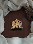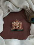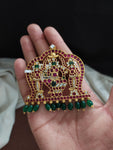 This Antique Kemp Pendant showcases the goddess Lakshmi, beautifully crafted with kemp, green, and white stones. It features a traditional design and comes with a back loop to easily attach it...