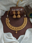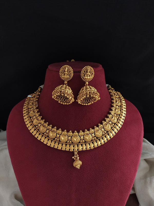 The set includes Lakshmi-studded jhumka earrings, adding a divine touch to your festive and cultural outfits while keeping the necklace design neutral.