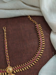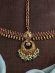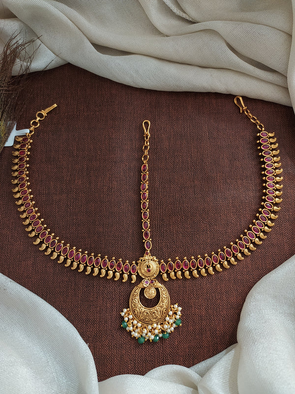 A classic Antique kemp stones tikka set crafted in rich temple-jewellery style. Designed with vibrant red–green kemp stones and antique gold finishing, this tikka adds an elegant traditional touch to bridal, festive, and cultural looks. Perfect for pairing with silk sarees, half-sarees, lehengas, or Bharatanatyam outfits.
