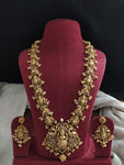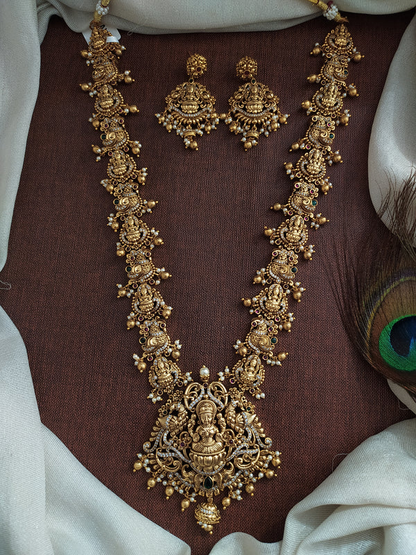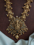 A majestic Antique Lakshmi Long Haram Set crafted in classic temple jewellery style, featuring Goddess Lakshmi motifs that symbolise prosperity, grace, and timeless tradition. Designed in a rich antique gold...