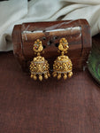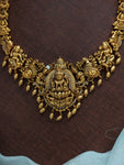 This magnificent Antique Lakshmi Long Haram Set showcases traditional Nagas craftsmanship, featuring intricate depictions of Goddess Lakshmi and peacock motifs. Adorned with dazzling Zircon stones, this set embodies the timeless beauty of antique jewelry. The matching jhumki earrings, crafted with precision, include charming golden ball danglings, offering a rich, authentic gold look.