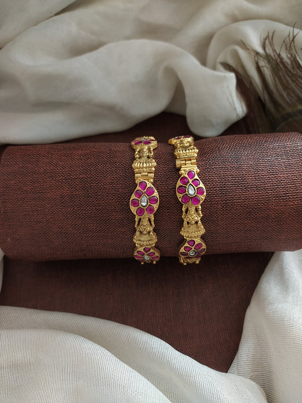 This antique openable screw-type Kada bangle features alternating motifs of Lakshmi and mango patterns, adorned with full red Jadau Kundan stones and white centers in mango designs. Crafted in rich...