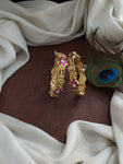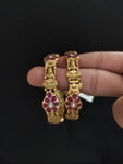 This antique openable screw-type Kada bangle features alternating motifs of Lakshmi and mango patterns, adorned with full red Jadau Kundan stones and white centers in mango designs. Crafted in rich antique gold tone, this bangle is a statement piece for traditional occasions. Available in standard sizes 2.4 & 2.6. Please note, pricing is for a single piece.