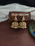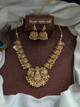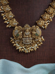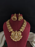 An exquisitely crafted antique Lakshmi necklace set featuring detailed nakshi work, shimmering zircon stones, and elegant peacock motifs. Paired with a matching jhumki, this set blends traditional artistry with a...
