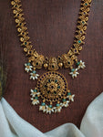 An elegant antique long haram set crafted with intricate Nakshi work, designed without any goddess or idol motifs. The detailed antique finishing gives a rich traditional feel while keeping the design versatile for all cultural and festive styling. Perfect for weddings, festive occasions, and traditional outfits when you want a classic antique jewellery look without religious motifs.